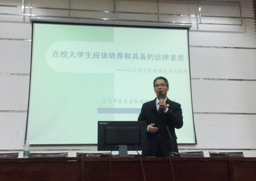 近日,集美区检察院公诉科科长吴晖检察官走进诚毅学院《思想道德修养与法律基础》课堂,为学院学生上了一堂法治公开课。