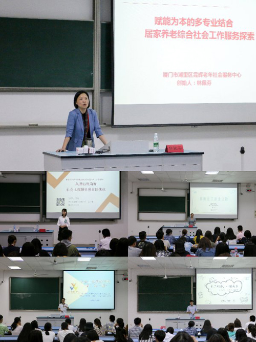 第二批全国专业社会工作领军人才、厦门市湖里区霞辉老年社会服务中心的创始人林佩芬,厦门市智行社会工作服务中心总干事郭锴,福建省妇联第十二届常务委员会委员、厦门市开心社工服务中心创始人及总干事韩秀云,厦门市沁心泉社会工作服务中心副总干事肖秀林,厦门市集美区和欣社工服务中心副总干事陈东,分别就社工个人以及社工机构的成长历程、多区域社会工作发展脉络梳理、社会工作领域前沿实务热点议题等进行主题式分享。他们强调,社会工作实务开展的几个重要维度是扎实专业服务、注重关系协调、精准需求识别与倡导良好沟通,就社会工作项目的品牌推广提出了独到见解。他们还与学院学生进行讨论,为其答疑解惑。