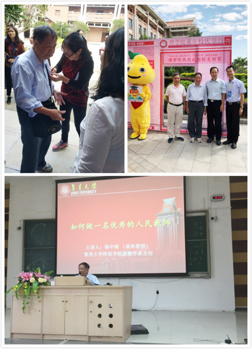 百年校庆日当天,获评百年校庆“金桥奖”、已近耄耋之年的理学院退休教师杨中南婉拒了学院提出的派车接送,自己搭公交车到学校参加校庆活动,并在百年校庆数学教育论坛会议上为我校师生作题为《如何做一名优秀的人民教师》的报告。