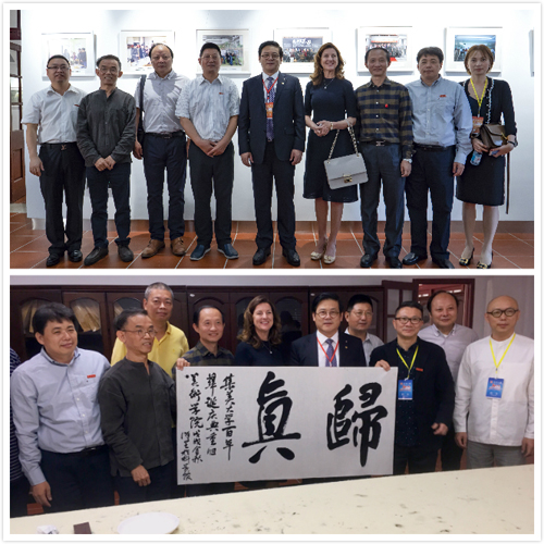 在美术学院领导的陪同下,徐里还参观了美术学院科学馆园区,会见校友并到美术学院美术馆观看学校百年校庆教师校友作品展,应邀在美术馆书画间现场为学院题字《归真》。
