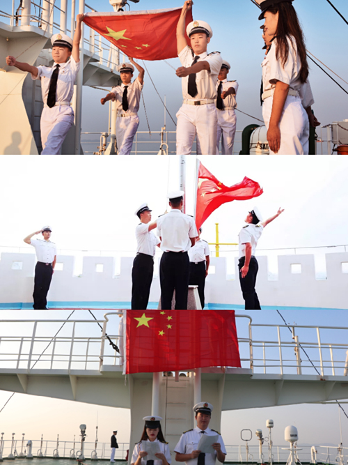 在校船“育德”轮上,学院组织航海1719、171A全体团员列队集合,参加升旗仪式,齐唱国歌。优秀团员青年代表以“我与祖国共奋进”为主题,围绕学习贯彻习近平总书记在纪念五四运动100周年大会上的重要讲话精神,结合个人学习情况和心得体会进行主题演讲,展现了当代青年与祖国同呼吸、与时代共奋进的爱国主义情怀和昂扬的精神风貌。