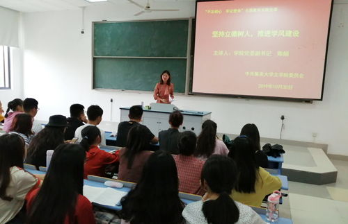 10月30日下午,文学院党委副书记陈娟以“坚持立德树人,推进学风建设”为题,为学院学生党员、学生干部上“不忘初心、牢记使命”主题教育专题党课。