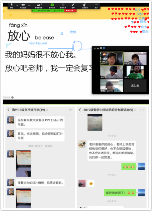 针对大部分国际学生所在国家与国内存在时差这一问题,学院结合学生的实际情况,将亚洲区学生线上课程推迟一个小时上课,对欧美国家和汉语基础薄弱的学生单独建立教学群。学院各班级任课教师采取共享课件、上课录屏的方式,主动利用慕课、在线视频、课堂弹幕、会议室聊天等一切可用资源和功能,充分发挥线上授课的长处,实现了学生自学和与老师交流的双向互动,营造了良好的学习氛围。