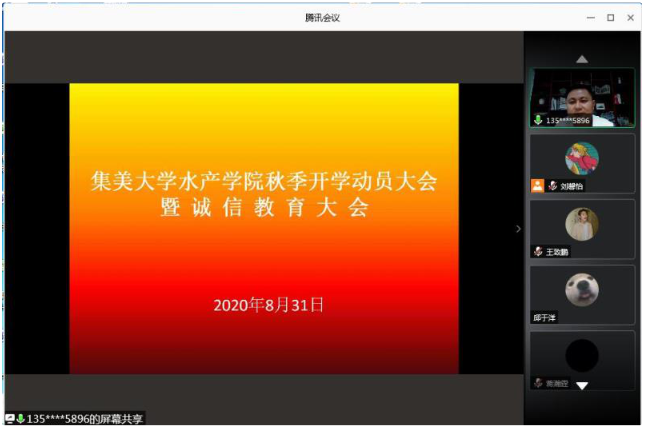 近日,水产学院在线上召开秋季开学动员暨诚信教育大会,进一步把学校秋季开学各项工作要求落到实处。学院党委副书记、副院长、团委书记、辅导员和2018级、2019级全体学生参加会议。