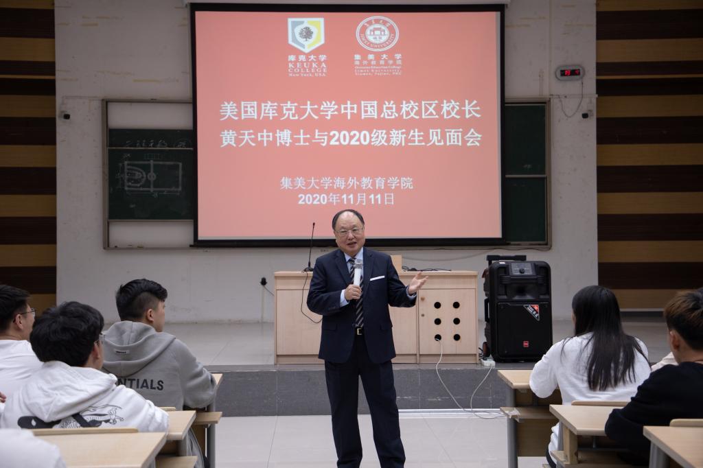 11月11日晚上,海外教育学院召开美国库克大学中国总校区校长黄天中博士与中美合作办学库克项目2020级新生见面会,会议由学院党委副书记陈茂才主持。库克项目相关老师和2020级336名新生参加了会议。