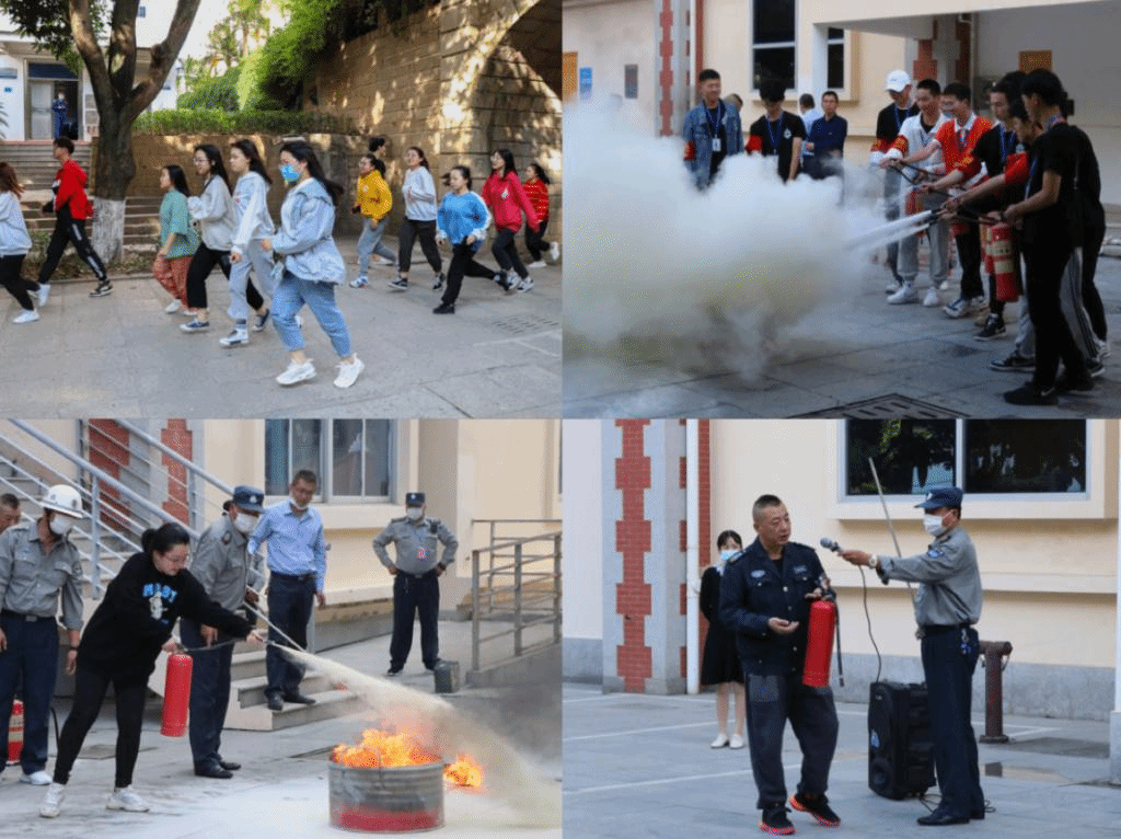 随着警报响起,全体学生迅速有序地撤离宿舍楼,到达指定地点集合。随后,2020级全体学生在古龙大礼堂广场参加灭火演练。活动现场,物业消防管理人员向同学们详细介绍了灭火器和消防栓等工具的使用方法,同时进行现场演示。在工作人员的指导下,各班同学纷纷进行灭火器使用实战演习。