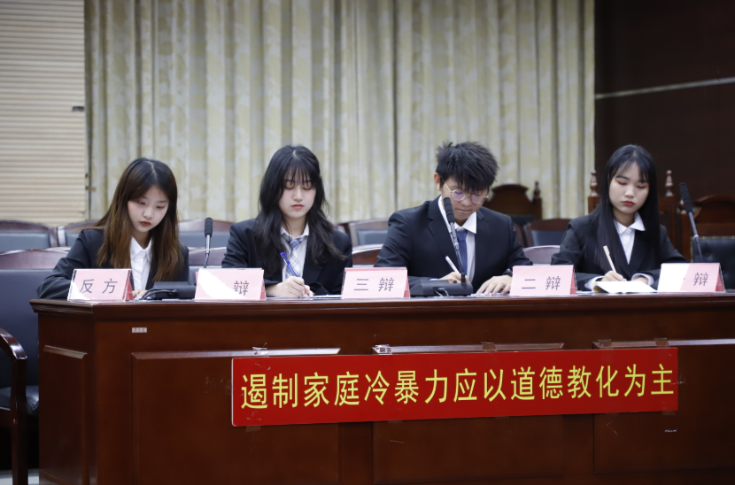 本次比赛主题为“遏制家庭冷暴力应以法律制裁为主还是以道德教化为主”。双方辩手通过对论点的论述与辨析,引导同学们理清婚姻家庭中法治和德治的关系,深入思考家庭冷暴力背后的法治理念与道德思维,切身认识法律与道德在实际生活中的独特性与重要性。