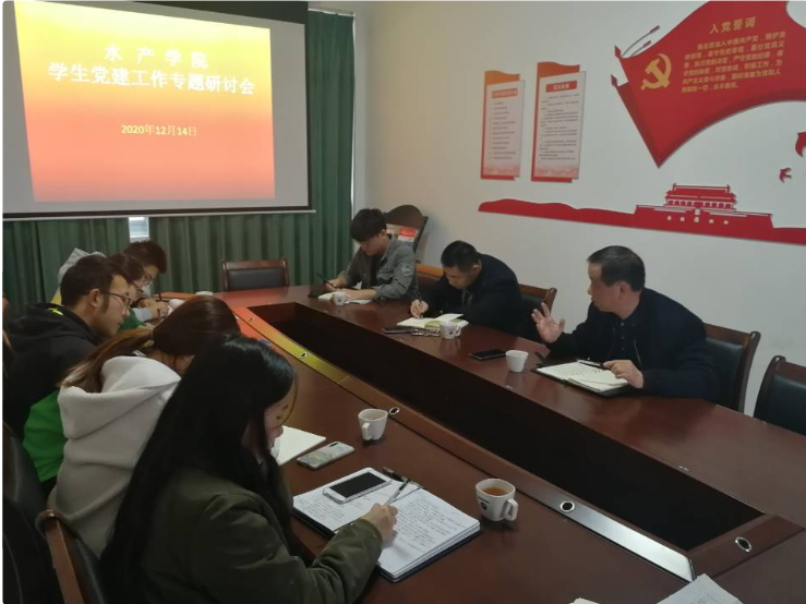 12月14日,水产学院在党员活动室召开2020年学生党建工作专题研讨会。院党委书记范惠莹同志出席会议。会议由院党委副书记黄庆胜同志主持,党委组织员、团委书记、各年级辅导员、学生党支部书记参加了会议。