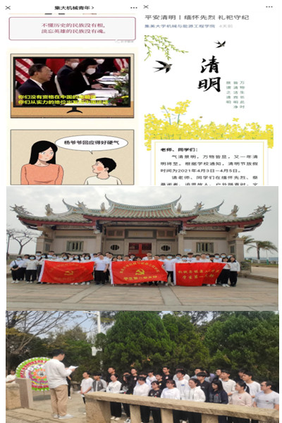 学院微信公众平台以《缅怀先烈、礼祀守纪》为题,引导老师、同学们在缅怀先烈、祭奠逝者、追思故人时,文明祭祀、严守各项纪律、树牢安全意识、规范自身言行。组织师生线上开展“传承美德、文明低碳祭扫”行动,进行“云上嘉庚”“中华英烈网”的“云上”祭扫。
