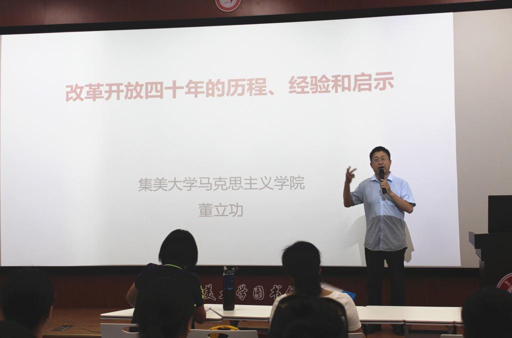 5月27日上午,图书馆举办题为“改革开放四十年的历程、经验和启示”的党史学习教育宣讲专题讲座。本场讲座由马克思主义学院董立功老师主讲。