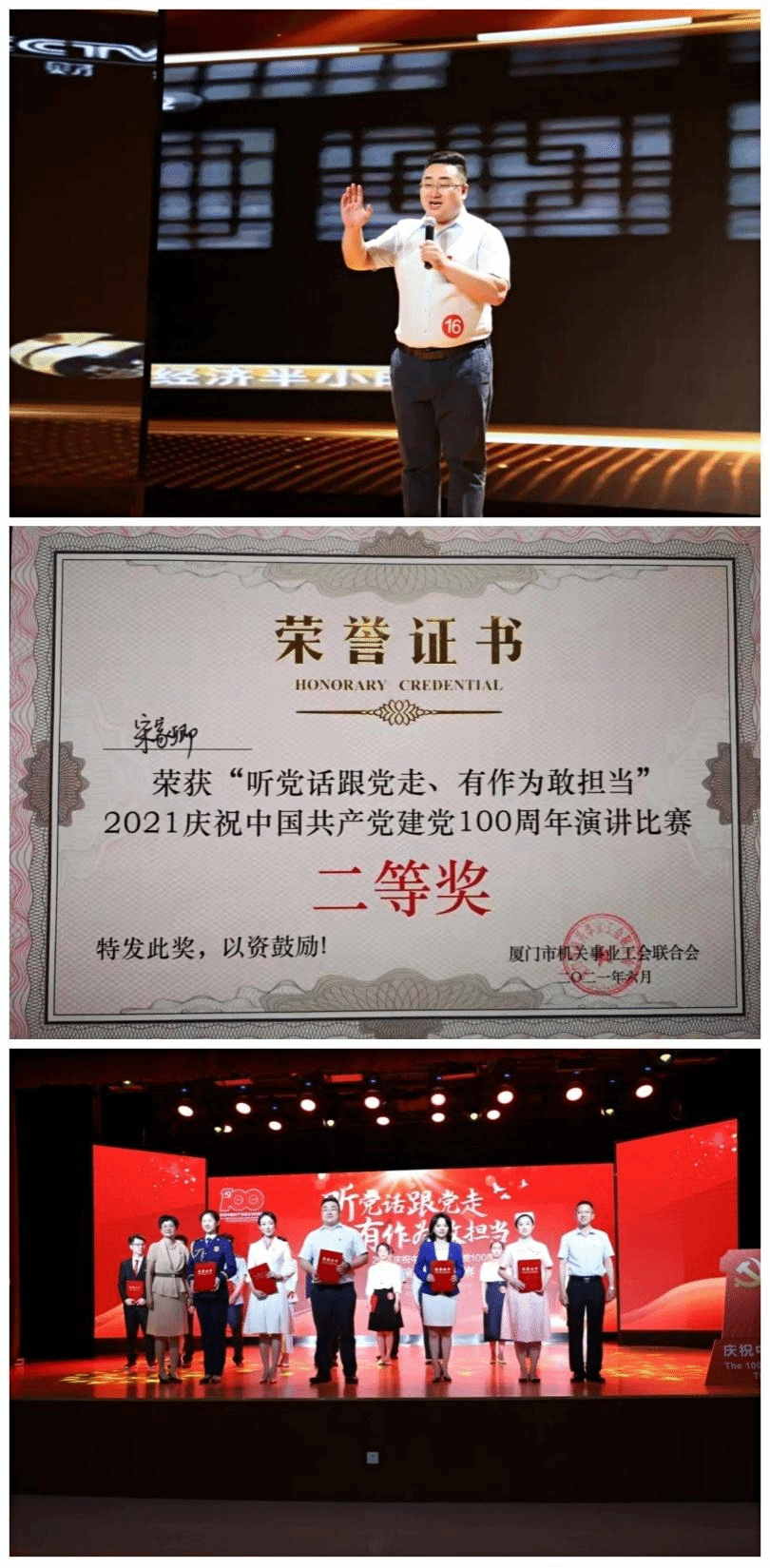6月25日下午,由厦门市机关事业工业联合会主办,厦门市工人文化宫承办的“听党话跟党走有作为敢担当”2021庆祝中国共产党建党100周年演讲比赛在文化宫多功能厅举行。由校工会选送的宋家卿老师经过激烈角逐获得二等奖。
