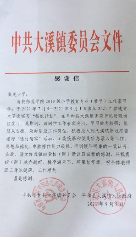 近日,师范学院收到中共平和县大溪镇委员会、平和县大溪镇人民政府发来的感谢信,就学院2019级小学教育专业(数学方向)江佳豪同学暑假期间在平和县大溪镇团委书记助理岗位的实习表现表示肯定和感谢。