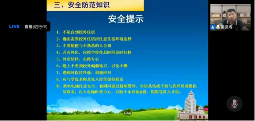 赖龙荣指出,本次线上讲座旨在帮助同学们“迈好大学生活的第一步”,使他们能够更加明确自身的责任和义务,尽快适应大学生活,希望同学们养成良好的行为习惯,平安快乐的渡过大学时光。