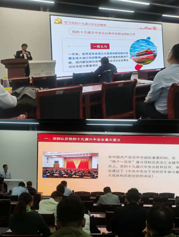 马克思主义学院梅进禄副教授应邀作题为《以伟大历史经验赢得更加伟大的胜利和荣光》辅导报告,深入阐述了党的百年奋斗的重大意义和历史经验、《决议》的主要内容和重大创新等内容。梅进禄的讲解深入浅出、生动翔实,让老师们对全会精神有了更进一步的了解。