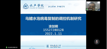 1月11日下午,受水产学院邀请,华中农业大学水产学院博士生导师涂加钢博士在腾讯会议上与我院师生进行学术交流。涂博士主要研究方向为鱼类病毒致病机理及免疫防治。此次,他作了题为“乌鳢水泡病毒复制的调控机制研究”的学术报告。报告会由陈天圣教授主持,水产学院部分师生参加。报告会上,涂加钢博士从乌鳢养殖产业最严重病原之一—乌鳢水泡病毒(SHVV)入手,揭示了乌鳢水泡病毒对我国乌鳢产业的危害,阐述了miRNA调节SHVV复制的机制研究、Leader RNA调节SHVV复制的机制研究、Hsp90-L互作调节SHVV复制的机制研究,对我国养殖乌鳢产业产量改善提供了现实依据。