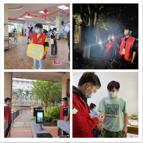 教工党员先锋队由自愿报名的党员教工组成,以落实防控要求,做好各项工作检查督导,加强对学生宿舍线上学习的督查和帮扶,协助学院做好因病因事外出闭环管理为主要任务;学生党员突击队帮助学生消杀、领取快递,协助老师完成疫情防控相关工作;校园巡逻队伍负责校园及周边围墙的巡逻,防止学生翻墙行为,劝导学生减少点外卖,劝导学生不聚集;防控志愿服务队伍做好校门和食堂进出人员的体温检测,协助检查出入证件,督导学生按要求排队和按要求就餐;教室督导队伍负责教室自修学生的体温检测和人数把控;实验室安全队伍负责实验室人员的体温检测和隐患排查;心理援助队伍通过电话接待师生心理咨询,答疑解惑,为师生提供心理援助。