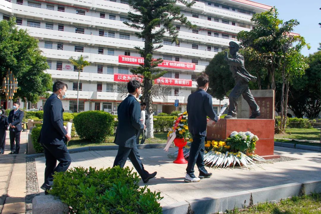 轮机工程学院党委书记郁军态、院长俞万能上前整理花篮挽联,全体成员向严力宾塑像鞠躬,并献上花束寄托哀思。