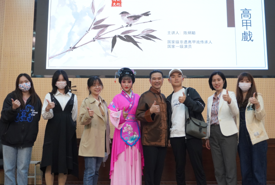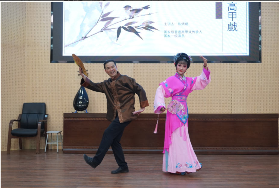 陈炳聪先生分别从高甲戏的形成历史、名称由来、地域分布、音乐及唱腔、主要乐器和表演特色等方面对高甲戏进行了深入介绍。通过南琶弹唱、角色表演等方式,向学生充分展示了高甲戏的艺术魅力。同时,通过现场互动的模式,让学生切身体验表演高甲戏,在实践中感悟体会。