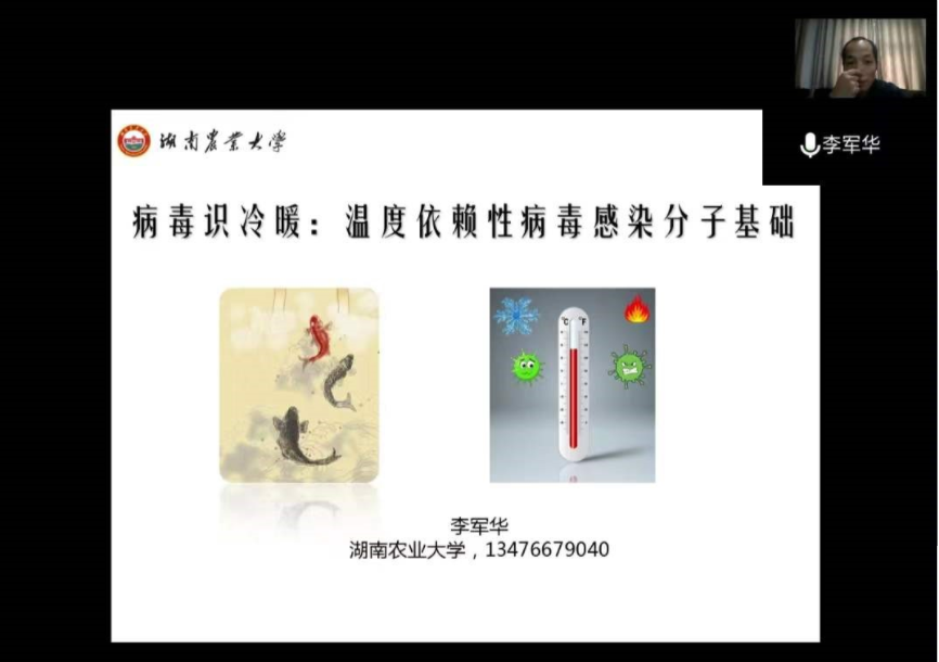 5月11日,应水产学院邀请,湖南农业大学李军华博士在腾讯会议上作了题为“病毒识冷暖:温度依赖性病毒感染分子基础”的学术报告。报告会由陈天圣教授主持。学院部分教师及研究生参加了会议。