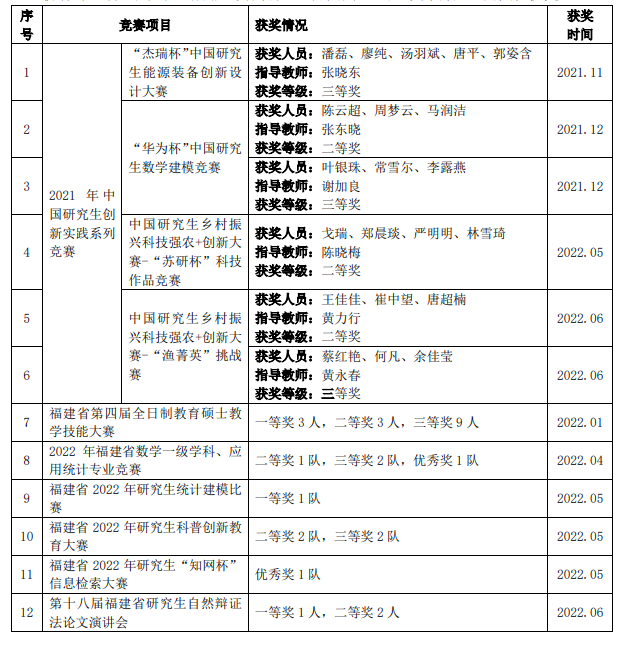 近期,我校研究生在由教育部学位管理与研究生教育司指导,中国学位与研究生教育学会和中国科协青少年科技中心主办,各主题赛事联合相关行业协会或产业联盟共同主办的2021年中国研究生创新实践系列竞赛屡获佳绩;在福建省学位办主办的系列赛事、福建省科学技术协会和福建省教育厅主办的第十八届福建省研究生自然辩证法论文演讲会中频频获奖。