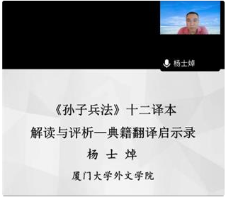 9月27日下午,厦门大学外文学院杨士焯教授在线上为外国语学院师生作了题为“《孙子兵法》十二译本解读与评析——典籍翻译启示录”的讲座。讲座由翻译团队负责人耿良凤博士主持,学院师生在线聆听讲座。