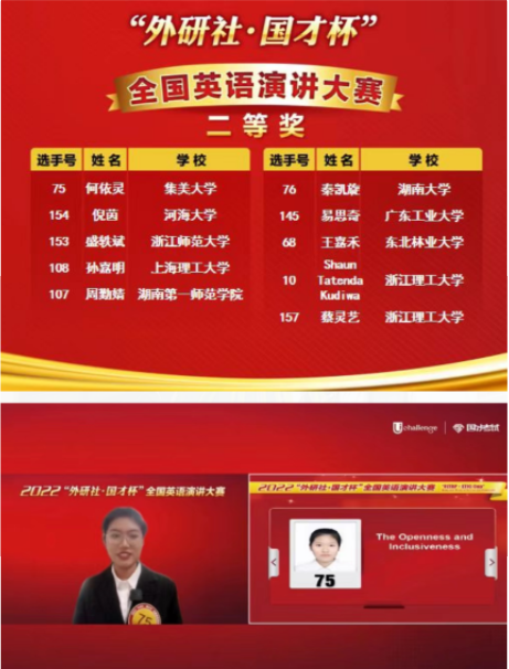 12月11日,2022年“外研社·国才杯”全国英语演讲大赛全国决赛圆满落幕。外国语学院英语2013班何依灵同学在学院程敏老师的悉心指导下,冲入全国88强,并最终荣获演讲比赛全国二等奖的好成绩。