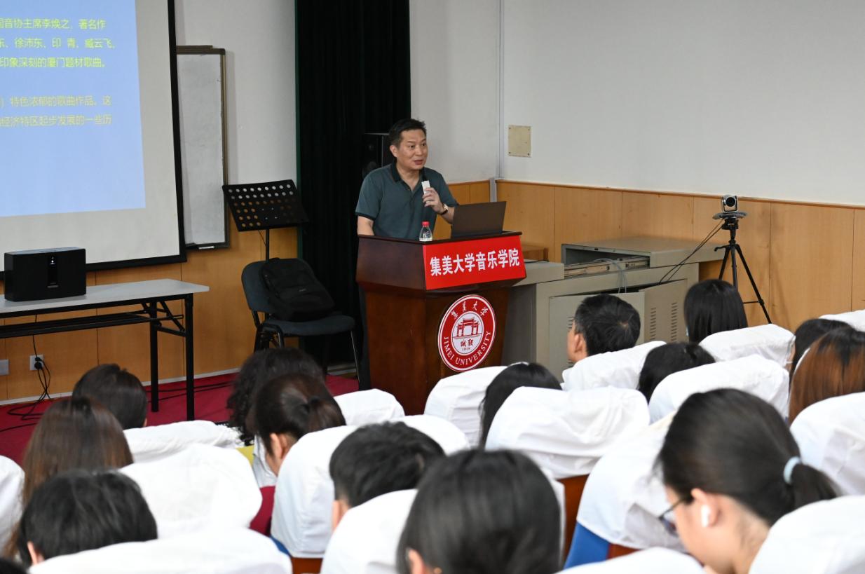 5月17日下午,音乐学院举办《在歌声中结识厦门》厦门题材原创歌曲作品分享会。活动邀请中国音乐家协会会员、厦门市音乐家协会副主席、作曲家许善飞主讲,学院党政领导班子、师生代表共同出席了本次分享活动。