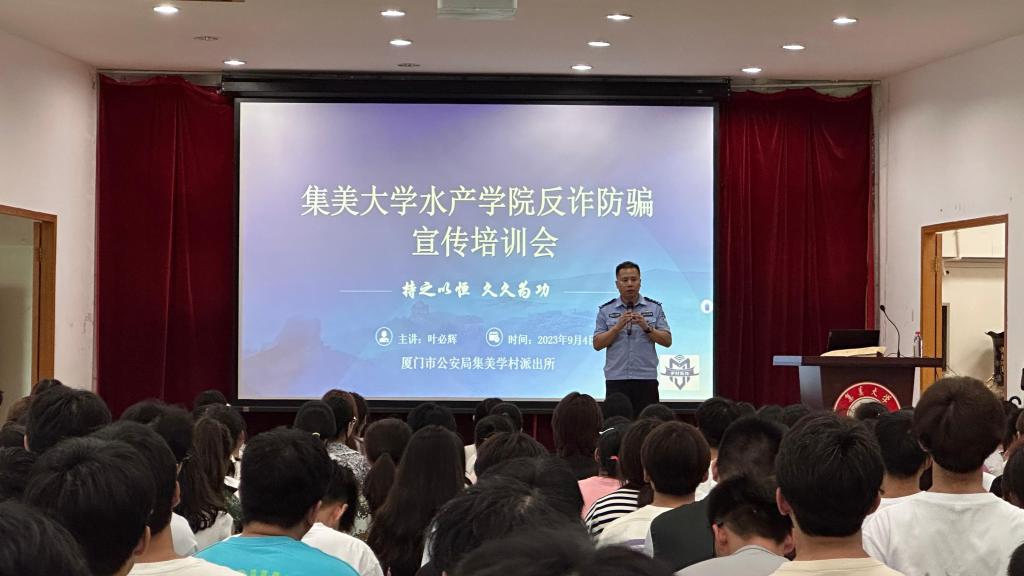 为增强新生安全防范意识,有效预防各类案件发生,9月4日上午,水产学院在综合楼6楼多功能厅召开2023级本科新生安全教育大会。会议邀请集美学村派出所叶必辉警官主讲,辅导员及全体2023级新生参加会议。