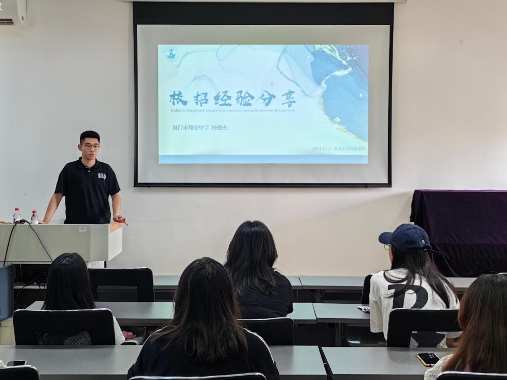 何晓琪、杨俊杰分别分享了自己的备考经验,从考前准备、片段教学、专业技能测试、结构化考试等方面对毕业生进行了指导,勉励他们找准方向、积极备考。