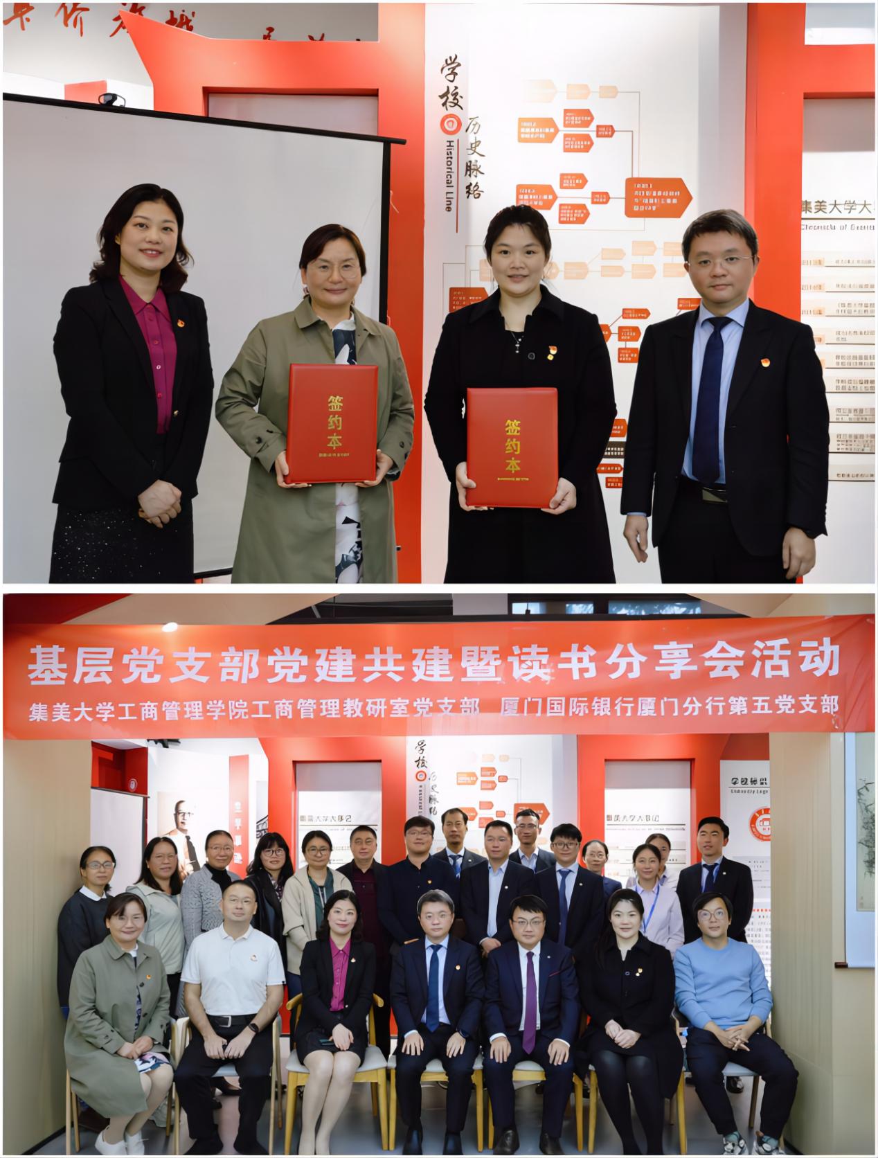 在厦门国际银行党委副书记、纪委书记黄仕志,工商管理学院党委书记陈娟共同见证下,工商管理教研室党支部和厦门国际银行厦门分行第五党支部签订了党建共建协议。双方还以“陈嘉庚精神”为主题开展了读书分享会活动。工商管理系主任吴江秋做了题为《陈嘉庚精神的学习、传播与弘扬》的主题发言。特邀嘉宾集友银行厦门分行副总经理陈为民分享了参与书籍《陈嘉庚与集友银行》写作的体会,新加坡华侨银行总经理谢栋铭分享了华侨银行与陈嘉庚的故事,厦门国际银行第五党支部书记苏艳、党员江航、杨春娇等分享了自身的感悟与体会。