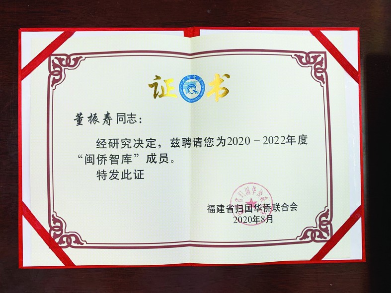 对待校侨联的工作,董振寿一直兢兢业业、认真负责。担任校侨联主席期间,董振寿每年组织学校归侨侨眷和老师们积极承接厦门市侨联课题调研,每年所承接的调研课题均约占全市的三分之一。课题贴近侨与嘉庚精神等相关内容,紧扣地方经济发展需求,其中不少被评为优秀课题、重点课题,有助于市侨联更好地了解侨情、开展侨务工作。在今年疫情防控工作繁忙的情况下,董振寿仍组织大家完成了14篇调研课题。