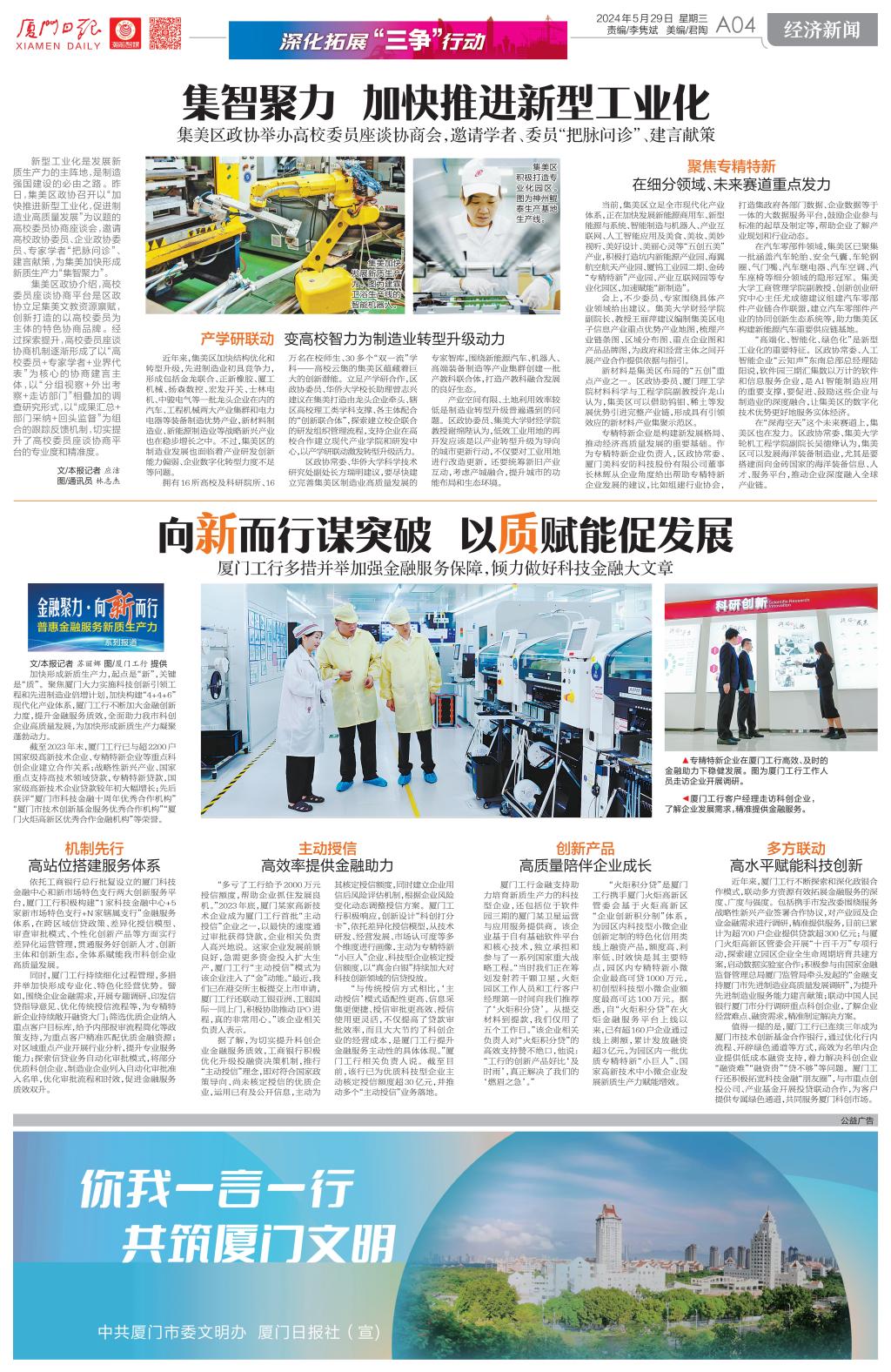 当前,集美区立足全市现代化产业体系,正在加快发展新能源商用车、新型能源与系统、智能制造与机器人、产业互联网、人工智能应用及美食、美妆、美妙视听、美好设计、美丽心灵等“五创五美”产业,积极打造坑内新能源产业园、海翼航空航天产业园、厦钨工业园二期、金砖“专精特新”产业园、产业互联网园等专业化园区,加速赋能“新制造”。